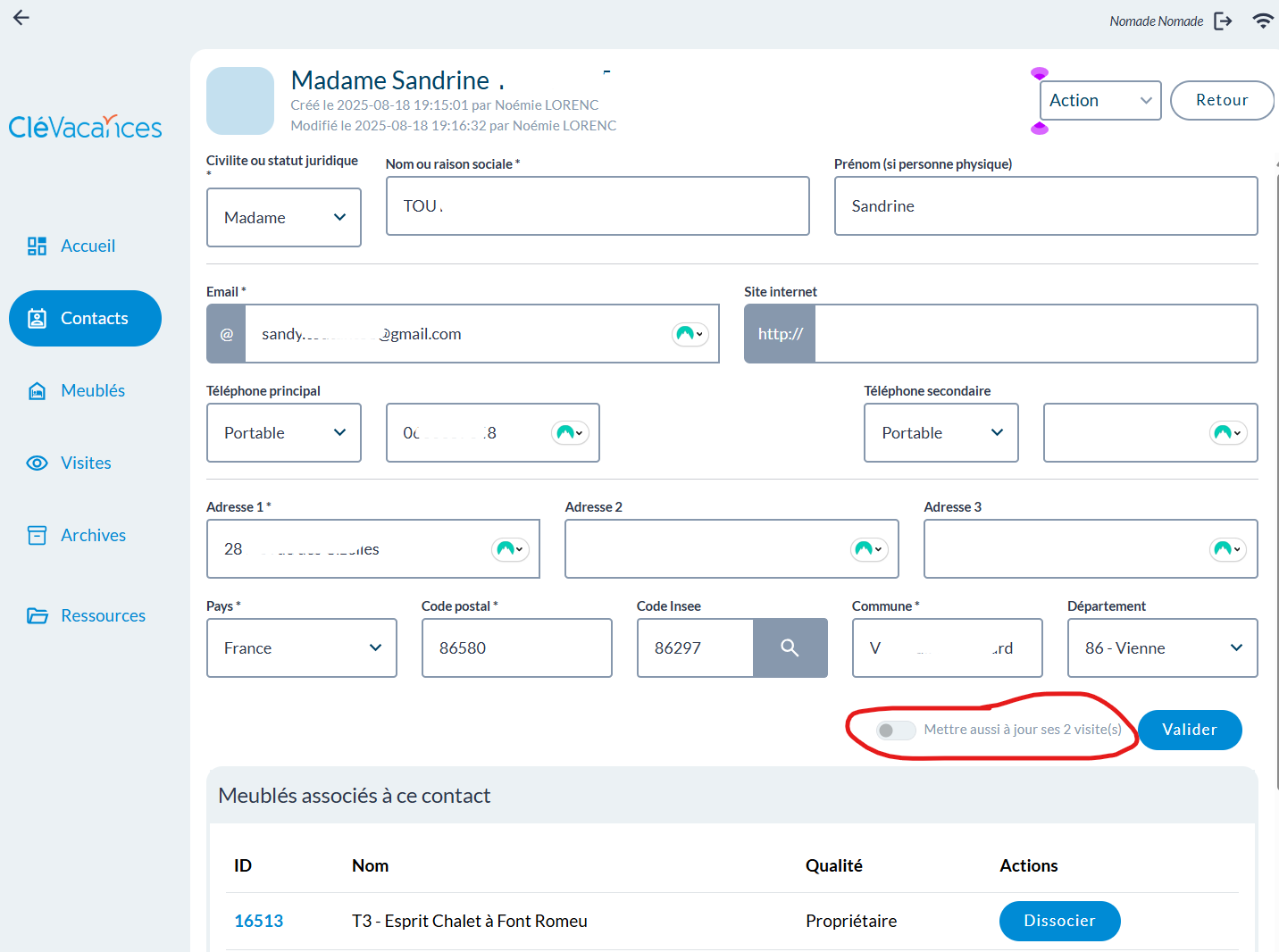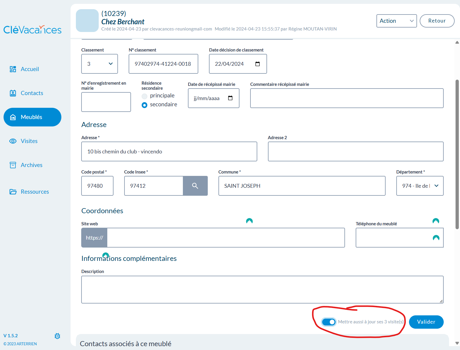 - possibilité de répercuter les modifications des coordonnés d'un meublé dans toutes ses visites :