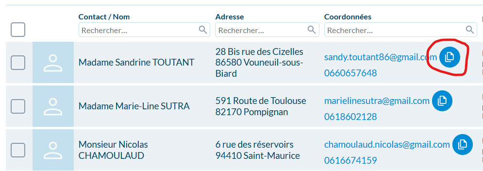 - possibilité de copier les adresses emails des contacts depuis les 2 listes :